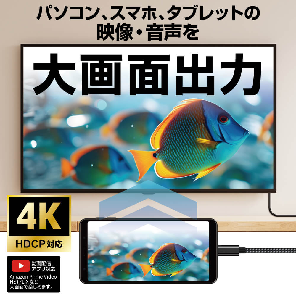 USB Type-C搭載機器の映像を、HDMI対応テレビやディスプレイへ最大4K(3840×2160)30Hzで出力できるケーブル。