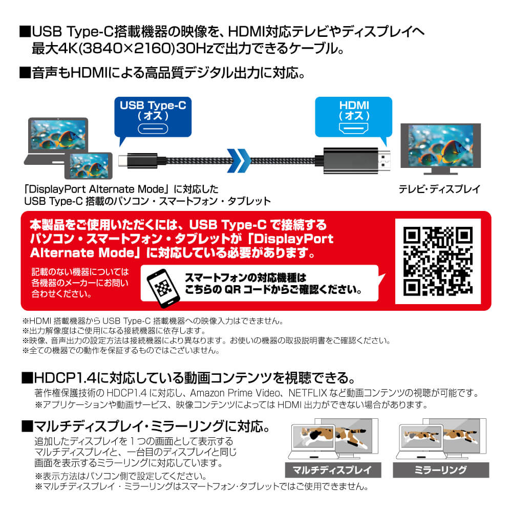 - 本製品をご使用いただくには、USB Type-Cで接続する パソコン・スマートフォン・タブレットが「DisplayPort Alternate Mode」に対応している必要があります。